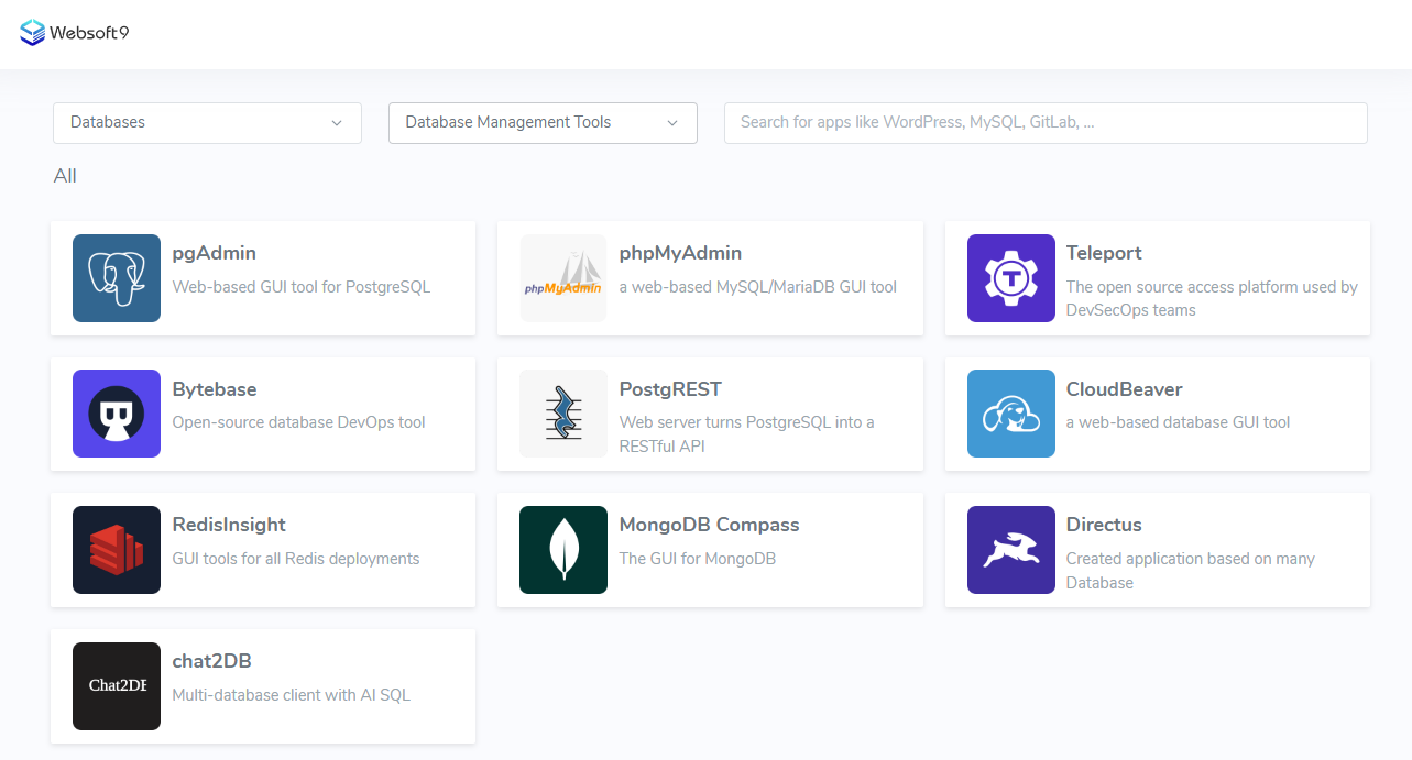 Websoft9 platform provides a wealth of Online database management tools that support common functions such as import/export, backup, SQL query, visualization, user management, access control and database auditing, ensuring that users can choose the most suitable management solution.